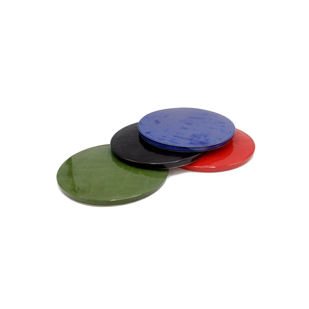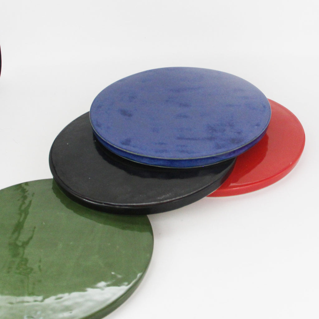 Ceramic platter that is both decorative and useful. It can be used for a cutting board, cheese board, trivet or just decoration. The Roundel is cast from earthenware and is hand glazed.